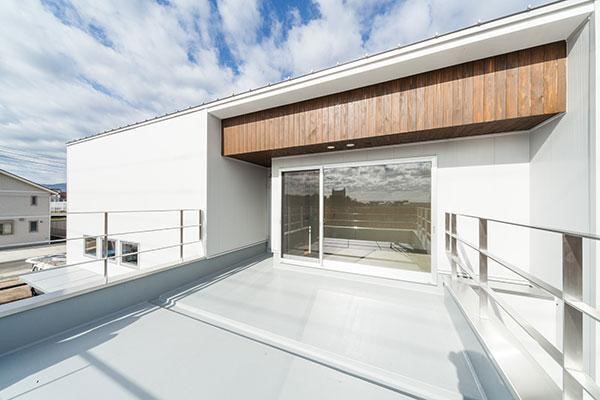 Phối cảnh chụp kế tiếp là một kết cấu phụ với phần mái che mà còn là hành lang dẫn ra phía sau ngôi nhà. Bố cục khá lạ mắt khi chúng chếch về một hướng làm nên một không gian riêng khi có thể sử dụng chúng làm nơi để một bộ bàn ghế mà đưa mắt nhìn thư giản hướng ra phía sân vườn. Có thể nhận ra cánh cửa ra vào sử dụng với gỗ tự nhiên và liên kết theo đó khi các bức tường cũng nhờ đến vật liệu từ gỗ để hỗ trợ cho việc trang trí.