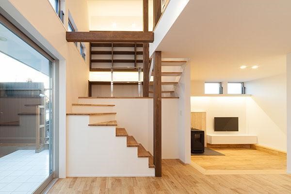 Cạnh ngay của ra vào là cầu thang dẫn lên mặt bằng gác lửng với nét tạo hình độc đáo và sự an toàn với độ dốc không quá cao, nhưng cần có một hệ thống rào chắn nhằm tạo nên sự an toàn cho mọi thành viên trong gia đình. Di chuyển vào trong là phòng khách nhỏ gọn nhằm dưới kết cấu từ gác lửng không gian bên trong thể hiện sự tối giản nhưng đầy sự ấm cúng từ gam màu vàng phản chiếu được phân bổ chỉ nằm trong khu vực phòng khách.