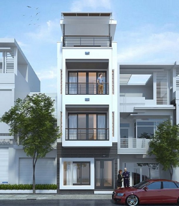 Mẫu nhà phố mặt tiền 4m với bản vẽ thiết kế nhà phố mặt tiền 4m tiện nghi. Bản thiết kế mẫu nhà phố đẹp với 1 tầng trệt cùng sân thượng đẹp bao quanh tiền sảnh, kết hợp kiến trúc lệch tầng hiện đại. Phía trên tầng 1 và tầng 2 có ban công nhô ra 1.2m vừa làm mái mát che cho sảnh tầng 1 vừa tạo khoảng đẹp cho các thành viên trong gia đình ngắm cảnh.