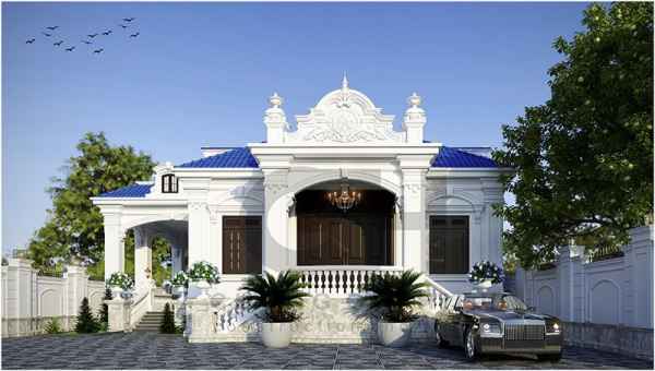 Công trình biệt thự vườn 1 tầng 4 phòng ngủ đẹp theo phong cách kiến trúc cổ điển, màu trắng chủ đạo làm nổi bật những mảng phù điêu và hoa văn tinh tế. Hệ thống cửa được làm bằng chất liệu gỗ tạo sự ấn tượng.
