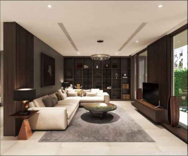 Nội thất của căn nhà được thiết kế tinh tê và khoa học. Bàn tròn và ghế sofa màu kem nổi bật trên tổng thể gam màu trung tính của không gian. Đã làm cho căn phòng trở nên nổi bật và nhiều đồ trang trí hơn được đặt trong tủ quần áo.