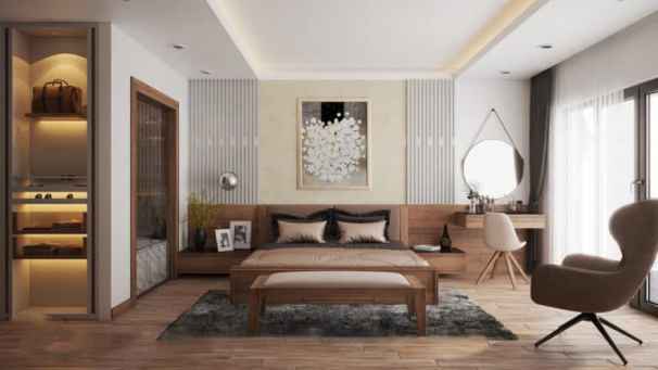 Các phòng ngủ của biệt thự 1 tầng 5 phòng ngủ đều có giếng trời với nội thất hiện đại và sang trọng. Điểm nhấn của không gian là những bức tranh với họa tiết độc đáo, thu hút. Màu sắc chủ đạo của phòng ngủ là màu kem. Kết hợp với nội thất gỗ mang đến hiệu ứng màu sắc nổi bật và tính thẩm mỹ cao.