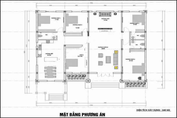 Từ nhu cầu đặt 5 phòng ngủ, dựa trên khảo sát thực tế, các kiến trúc sư từ đó đưa ra phương án bố trí mặt bằng biệt thự vườn Cấp 4 như sau: Có một phòng khách rộng và thoải mái từ hiên chính đến cửa ra vào. Có một nhà nguyện trang trọng trong phòng khách thiết kế dẫn thẳng vào bên trong. Bên phải có 2 phòng ngủ có vệ sinh khép kín tiện sử dụng kết nối với không gian của ngôi nhà biệt thự 1 tầng có 5 phòng ngủ