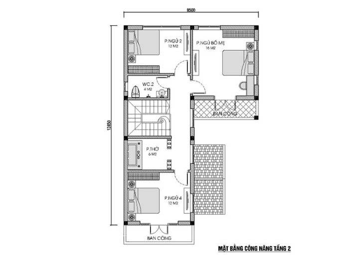 Công năng bản vẽ biệt thự 2 tầng này cũng được bố trí khá tỉ mỉ, đem lại sự thoải mái tốt nhất cho các thành viên yêu quý. Mỗi căn phòng đều được tính toán diện tích rõ ràng, phân chia khu vực một cách khoa học và hợp phong thủy của chủ nhân. Biệt thự sân vườn kết hợp mái thái này có 4 phòng ngủ riêng rộng rãi, đáp ứng nhu cầu nghỉ ngơi cho gia đình đông thành viên sinh sống.