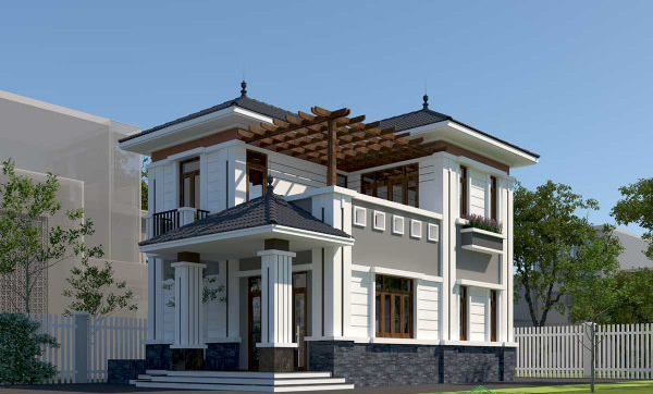 Ngôi nhà lựa chọn nét kiến trúc hiện đại với điểm nổi bật dễ dàng nhận ra là khối hình được đặt lại với nhau theo tỉ lệ cân xứng, bao phủ lên là lớp sơn trắng trang nhã được sử dụng phổ biến cho những mẫu nhà theo phong cách này. Để thêm điểm nhấn, tránh nhàm trán cho tường, kiến trúc sư sử dụng đường phào chỉ nhẹ nhàng xung quanh nhà. Sử dụng thêm cột trụ chắc chắn, vững chãi, kích thước lớn cho thấy độ bề thế của căn nhà với phần chân cột được ốp đá vừa tạo được điểm nhấn vừa bảo vệ chân cột khổi những tác động từ bên ngoài môi trường.