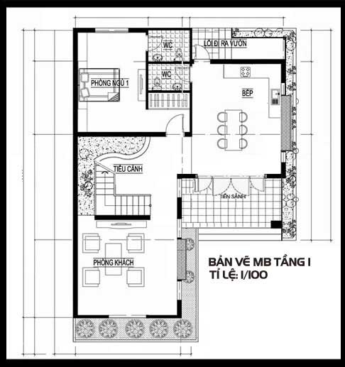 Bắt đầu từ sân bước vào đó là không gian phòng khách, sâu bên trong qua cầu thang là không gian phòng bếp kết hợp với bàn ăn. Tiện nghi của ngôi nhà được sắp xếp khoa học, đảm bảo cho quá trình lưu trữ, chế biến thức ăn được thuận tiện nhất có thể cho người nội trợ. Phía trong góc nhà được bố trí 1 nhà vệ sinh chung, nội thất đầy đủ, đáp ứng nhu cầu sinh hoạt của các thành viên khí có nhu cầu.