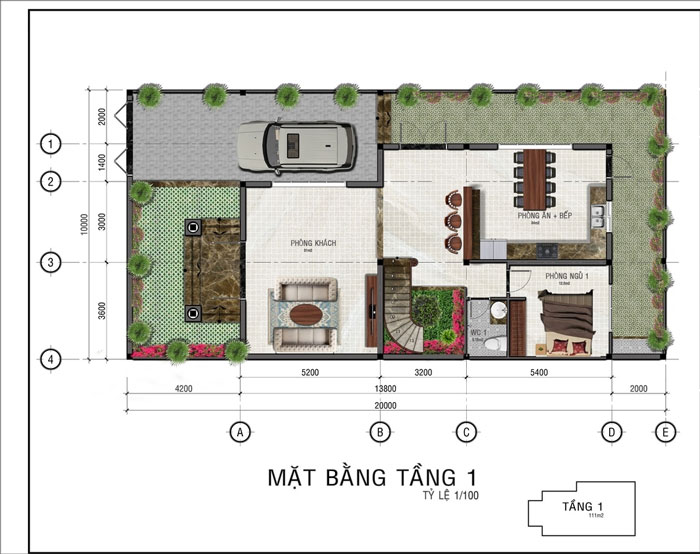 Tại mặt bằng tầng 1 của mẫu biệt thự 4 tầng 100m2, kiến trúc sư bố trí 1 căn phòng ngủ ở ví trí song song với không gian bếp. Nhà vệ sinh được bố trí cạnh với phòng ngủ, thuận tiện cho gia chủ sử dụng. Cầu thang được bố trí ở vị trí chính giữa nhà, giữa phòng khách và khu vực bếp + bàn ăn. Bên dưới cầu thang bố trí tiểu cảnh cây xanh tạo không gian xanh, điều hòa không khí từ giếng trời phía trên.
