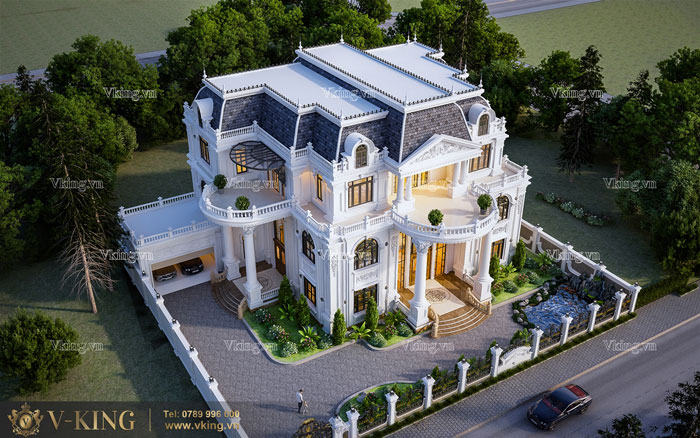 Tầng 4 của mẫu biệt thự 4 tầng 100m2 này là kiến trúc mái hình thang đặc trưng Pháp cổ điển. Những khung cửa vòm cùng với họa tiết nổi bên ngoài sơn trắng nổi bần bật giữa màu ngói xanh dương của mẫu biệt thự 4 tầng 100m2 hoàn tất tổng thể ấn tượng cho gia chủ sở hữu.