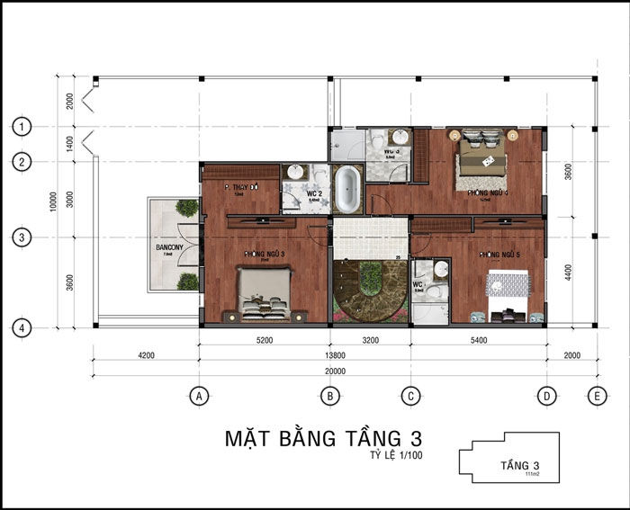 Mặt bằng tầng 3 của mẫu biệt thự 4 tầng 100m2 bố trí lên đến 3 phòng ngủ và cả 3 phòng đều có nhà vệ sinh bên trong giúp thành viên sở hữu căn phòng ngủ này có được một không gian riêng tư nhất có thể. 1 trong số 3 phòng ngủ ở đây được thiết kế thành phòng ngủ master với thêm một không gian thay đồ, 1 ban công rộng lớn.