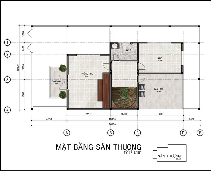 Lên đến mặt bằng tầng 4 của mẫu biệt thự 4 tầng 100m2 của gia chủ được bố trí phòng thờ, kho, sân phơi và nhà vệ sinh.