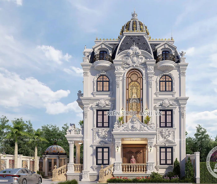 Cột trụ vuông cùng với họa tiết đi cùng là điểm nổi bật tại mặt tiền của mẫu biệt thự 4 tầng 100m2 mang đến màu sắc cổ điển, đặc trưng nét kiến trúc châu Âu thế kỷ 17. Ô cửa kính vòm được nối thông giữa 2 tầng nhà với nhau cùng với nét trang trí cầu kỳ, lại được hiệu ứng ánh sáng từ trong nhà hắt ra càng nhấn mạnh vào không gian ấy, giúp mẫu biệt thự 4 tầng 100m2 càng trở nên nổi bật về sự xa hoa, sang trọng mà gia chủ đang sở hữu. Cuối cùng là kiến trúc mái với ngói xanh đặc trưng cùng với chi tiết được dát vàng tuy nhỏ nhưng đủ để kéo sự thu hút chú ý của bất kể một ai đi ngang qua.