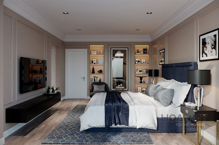 Nội thất lựa chọn với phần giường ngủ bọc vải nhung mang đến sự sang trọng cho không gian. Tivi gắn tường cùng tủ kệ trang trí – nơi lưu trữ kỷ niệm của gia chủ đều được đắt gắn vào trong tường để tiết kiệm diện tích. Những đồ nội thất khác như: tủ để đầu giường hay đèn ngủ đều có thiết kế đơn giản cùng với màu sắc trắng đen thu hút. Và một chiếc thảm trải sản bằng vải nhưng cũng là điểm nhấn quan trọng, hoàn thiện vẻ đẹp của không gian ngủ hơi hướng cổ điển.