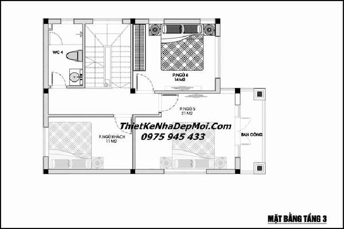 Mặt tiền tầng 3 của mẫu biệt thự 4 tầng 8x10m bao gồm: 3 ngủ và 1 nhà vệ sinh. Trong đó 1 phòng ngủ có diện tích lớn hơn và kèm theo ban công hướng ra phía mặt tiền của ngôi nhà.
