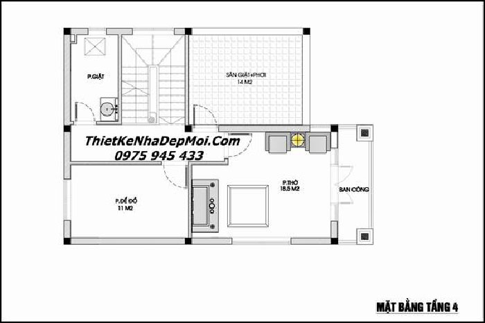 Mặt bằng tầng 4 có không gian như sau: phòng thờ, phòng để đổ, phòng giặt và sân giặt phơi. Không gian thờ cúng của gia đình được bố trí ở mặt tiền của ngôi nhà, có cửa hướng ra ban công phù hợp với tâm linh của người Việt Nam.