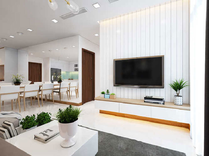 Nội thất phòng khách sử dụng bộ ghế sofa có kích thước nhỏ gọn, tivi gắn tường cùng tủ kệ bên dưới. Trong không gian được bao phủ bởi màu trắng như thế này thì tiểu cây xanh – chậu nhỏ sẽ là điểm nhấn quan trọng giúp không gian ấy trở nên xanh mát, hài hòa ánh nhìn.