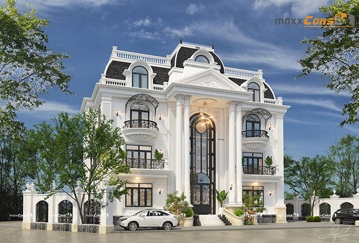 Phối cảnh mặt tiền cho mẫu biệt thự 4 tầng 8x14m sử dụng phong cách kiến trúc tân cổ điển đã giành được rất nhiều sự yêu thích của gia chủ hiện nay. Mẫu biệt thự 4 tầng 8x14m hiện lên với mặt bằng tầng 1 có hệ thống cổng rào vô cùng chắc chắn với đường cong mềm mại, với những họa tiết mang đậm nét cổ điển mang đến vẻ đẹp sang trọng, phù hợp với tổng thể công trình.