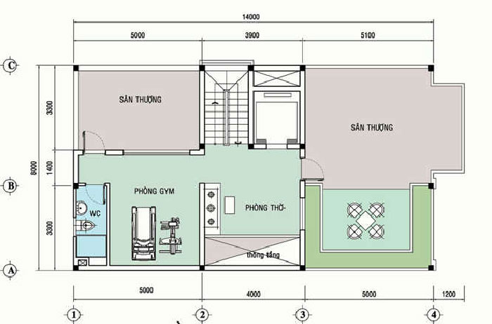 Mặt bằng tầng 4 của mẫu biệt thự tầng 4 8x14m bao gồm: phòng thờ, phòng gym, sân thượng, nhà vệ sinh.