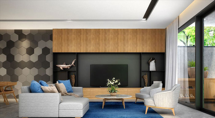 Không gian phòng khách trong mẫu biệt thự 4 tầng 8x14m gợi ý lựa chọn phong cách kiến trúc hiện đại. Sử dụng tone màu trầm với: khoảng tường được ốp đá đen trắng, nội thất sử dụng gỗ công nghiệp cao cấp vừa hiện đại lại vừa sang trọng. Bộ bàn ghế sofa nhỏ nhưng đáp ứng đầy đủ công năng để gia chủ tiếp đón những vị khách đến chơi nhà. Không gian này trở nên thông thoáng hơn, tràn ngập ánh sáng hơn khi sử dụng hệ cửa khung kính vững chắc hai cánh. Để hạn chế ánh sáng quá ngắt khi trời nắng thì hệ màn khung trắng giúp gia chủ hạn chế được nắng nóng cho không gian.