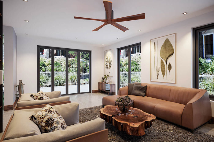 Để có được cảm nhận như thế, nội thất lựa chọn sử dụng tone màu ấm như nâu, mà nâu gần với gỗ tự nhiên nhất. Điều này thể hiện rõ trong bộ bàn ghế sofa mà gia chủ đang sử dụng. Bộ ghế này được bọc da càng thể hiện rõ độ sang trong tổng thể không gian phòng khách. Ánh sáng màu vàng chính là điểm cuối cùng để không gian này đạt được độ chuẩn xác về độ ấm.