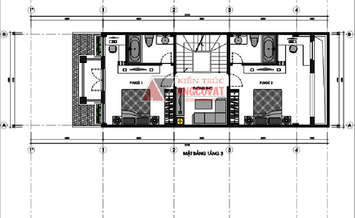 Mặt bằng tầng 3 của mẫu biệt thự 4 tầng 90m2 bao gồm: 2 phòng ngủ và một phòng sinh hoạt chung. Điểm đặc biệt trong không gian này chính là trong hai phòng ngủ đều có nhà vệ sinh bên trong tạo ra không gian riêng tư dành cho thành viên sử dụng. Một phòng ngủ có lối ra ban công tạo ra cảm giác thích thú mối sáng sớm với ánh sáng mặt trời rọi chiếu toàn bộ không gian tạo nên nguồn năng lượng tươi mới chuẩn bị cho ngày làm việc, thích hợp cho cặp vợ chồng sử dụng.