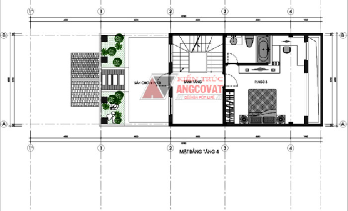 Cuối cùng là mặt bằng không gian tầng 4 với 1 phòng ngủ có nhà vệ sinh bên trong, 1 không gian sân thượng rộng lớn, chiếm gần nửa diện tích 90m2 của mẫu biệt thự 4 tầng 90m2. Phần sân thượng này được gia chủ bố trí tiểu cây xanh tạo nên không gian vườn mini vô cùng thông thoáng, xanh mát. Thường ở những không gian như vậy gia chủ đặt bộ bàn trà nhỏ, hay bàn ăn nhỏ để mỗi cuối tuần, hay dịp đặt biệt nào đó cả gia đình cùng bạn bè, người thân tụ tập ăn uống trong không gian giữa bầu trời rộng thoáng kia.