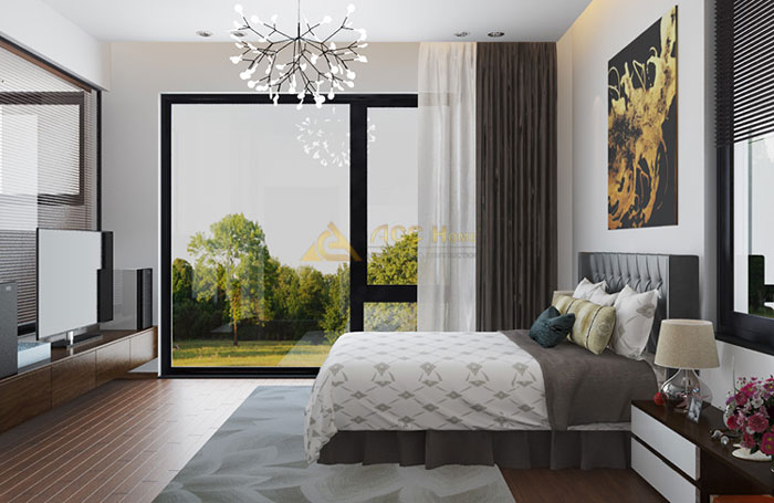 Với phòng ngủ nhằm để tạo nên một không gian ấm áp để gia chủ có được giấc ngủ sâu thì trắng và nâu là sự lựa chọn hoàn hảo. Giường có thiết kế đơn giản nhưng phần đầu được bọc da ấn tượng, sang trọng. Ngoài ra: tủ để đầu giường nhỏ gọn, tivi cùng kệ bên dưới đáp ứng được nhu cầu của gia chủ. Điểm nhấn với bức tranh trừu tượng, tấm thảm lông mịn cùng với chiếc đèn chùm đơn giản nhưng bắt mắt đã hoàn thiện không gian ngủ hiện đại nhưng vô cùng sang trọng cho gia chủ.