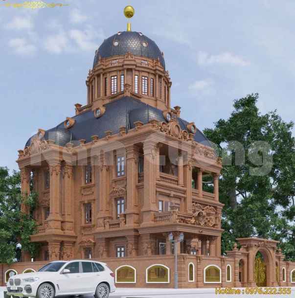 Mẫu biệt thự lâu đài phong cách Châu Âu cổ điển được xây dựng trên khu đất rộng 300 m2. Ngôi biệt thự rất độc đáo với sự kết hợp điển hình giữa vẻ đẹp mềm mại, mê hoặc của Châu Âu và kiến trúc lâu đài. Mái ngói xanh của biệt thự kết hợp với màu sơn nâu đặc trưng đã mang đến cho chủ đầu tư một thiết kế ấn tượng. Kiến trúc biệt thự được trang trí tỉ mỉ và công phu với tiền sảnh sử dụng hệ thống cột trụ tròn, toát lên vẻ đẹp lộng lẫy, quý phái. Các bức phù điêu được thiết kế tỉ mỉ, đặt ở vị trí cao hơn so với mặt ngõ ban công.