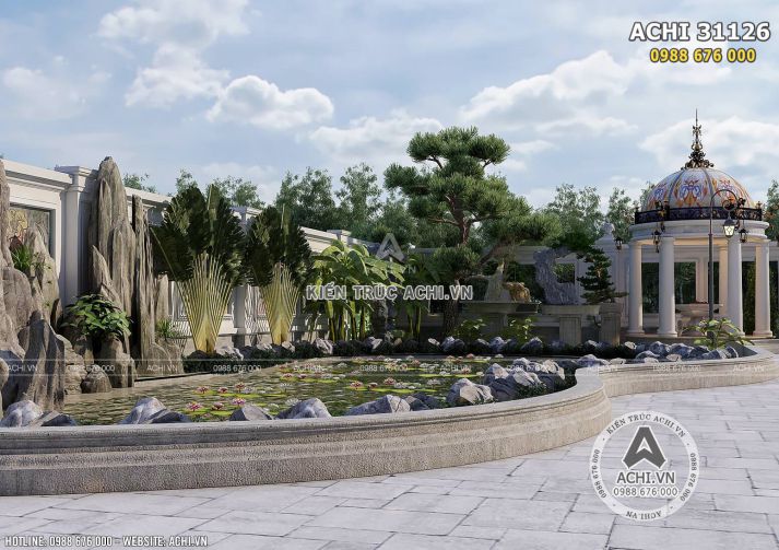 Phần khuôn viên được quy hoạch rõ ràng, rộng, thoáng và tiện nghi sử dụng. Bên cạnh thảm cỏ, cây xanh, cây cảnh phong thủy còn có không gian dành cho bể cá và hồ bơi, khu vực nghỉ ngơi, thư giãn…