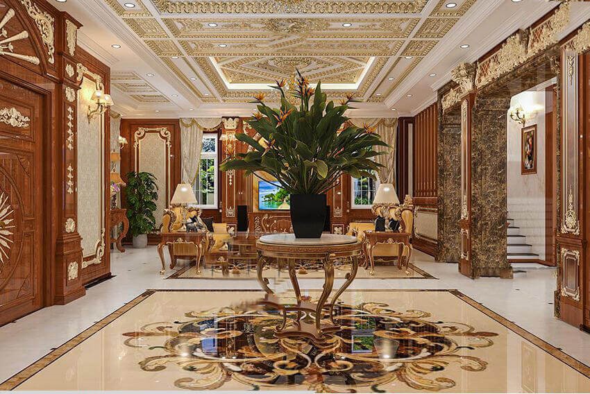 Làm nên vẻ đep toàn diện cho căn biệt thự cổ điển 4 tầng này không thể không nhắc đến sự tinh tế trong thiết kế nội thất. Bước vào bên trong căn biệt thự này bạn sẽ phải thốt lên bởi sự ngạc nhiên đến bất ngờ. Nó giống như bạn đang chuẩn bị khám phá công trình kiến trúc lâu đài cổ điển ở trời Tây vậy. Toàn bộ những đường nét, hoa văn, chỉ từng, phào chỉ trang trí đều được làm bằng gỗ cao cấp. Chưa kể đến ở mỗi phòng chức năng là sự xuất hiện của những họa tiết, hoa văn đặc sắc riêng biệt, không lẫn với ai.