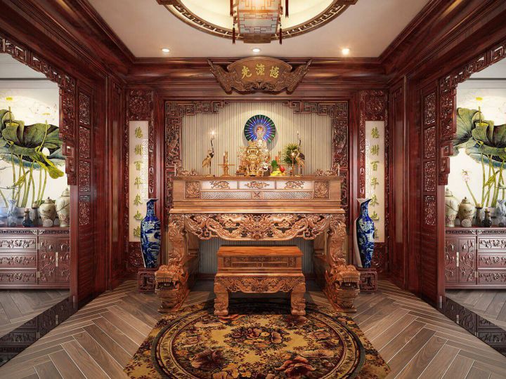 Phòng thờ của căn biệt thự cổ điển này khiến cho người ta không khỏi ngạc nhiên, trầm trồ trước những đường nét, hoa văn được trang trí cầu kì, tỉ mỉ. Những bước hoành phi, câu đối được điêu khắc tinh tế trên nền gỗ tự nhiên cao cấp càng làm tăng sự tôn nghiêm cho không gian này. Căn phòng sử dụng gam màu nâu trầm tạo sự ấm áp cho không gian vốn lạnh lẽo, xa cách này.