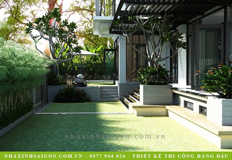 Không gian xanh bao quanh nhà càng làm cho ngôi biệt thự trở nên nổi bật hơn. Từng bồn cây, chậu hoa đều được ốp đá trắng thanh khiết, càng làm tôn lên vẻ đẹp tổng thể ngoại thất cho công trình. Vườn cây cảnh được thiết kế như bức tranh thiên nhiên tràn đầy màu sắc, mang đến cho gia chủ và gia đình cảm giác thư thái, thảnh thơi trong những giờ phút nghỉ ngơi, thư giãn.