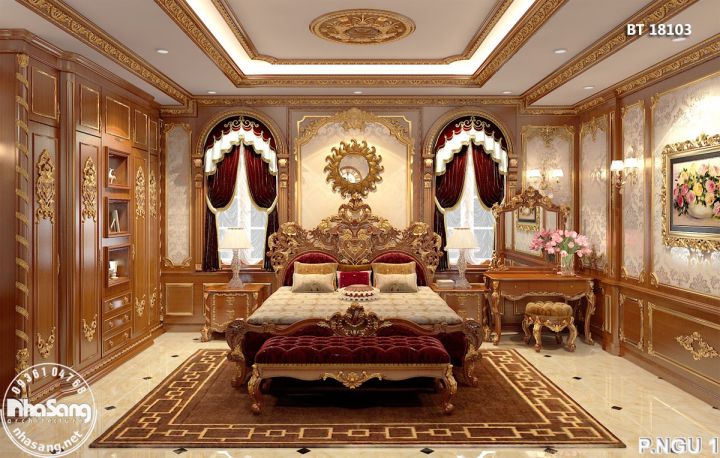 Điểm nổi bật trong nội thất phòng ngủ phong cách cổ điển nằm ở chiếc giường ngủ. Từ chiếc giường, chúng ta có thể xác định được hình dạng, kích thước của những món đồ nội thất còn lại. Toàn bộ những món đồ nội thất trong phòng ngủ như bàn trang điểm, bộ ghế ngồi thư giãn, tủ quần áo…đều sở hữu kiến trúc mềm mại với những đường nét hoa văn tinh tế.