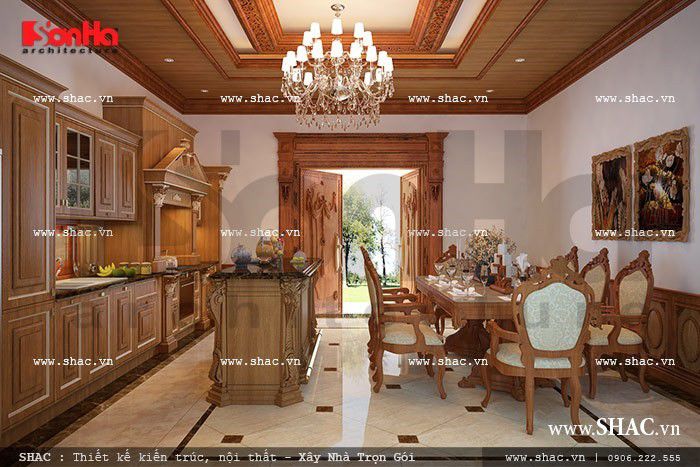 Thiết kế nội thất phòng bếp sử dụng gam màu phong phú từ kem nhạt đến màu nâu đậm. Những nói đồ gỗ nội thất vừa mang yếu tố thẩm mĩ lại đảm bảo được công năng sử dụng. Tay nắm tủ bếp thường được trang trí bằng đồng cách điệu hoặc mạ vàng. Những món đồ dùng trong nhà bếp nuhw bếp ga, tủ lạnh đều được giấu đi một cách tinh tế.