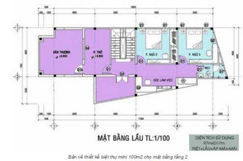 Phía trên tầng 2 của kiểu nhà biệt thự đẹp diện tích 100m2 này được bố trí 2 phòng ngủ và 1 nhà vệ sinh. Phần còn lại là phòng thờ được thiết kế không gian yên tĩnh. Diện tích còn lại chúng tôi sử dụng dành cho sân thượng nơi đây có thể bố trí thêm chậu cảnh, trồng hoa tùy theo sở thích của mỗi người.
