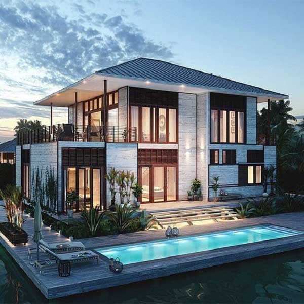 Nếu như gia chủ mong muốn có ngôi biệt thự mái Thái mang phong cách bán cổ điển thì đây là một lựa chọn tuyệt vời và hoàn hảo, gam màu nâu be thời thượng thuần khiết kết hợp cùng với mái Thái vô cùng nhiều công năng, lan can tinh xảo và các cột trụ chắc chắn giúp cho căn nhà thêm phần vững trãi. Thiết kế ngôi biệt thự mini 2 tầng mái Thái với hình khối vuông vức vô cũng mãn nhãn, ưu điểm nổi bật là không gian mở của căn nhà và bể bơi trước nhà.