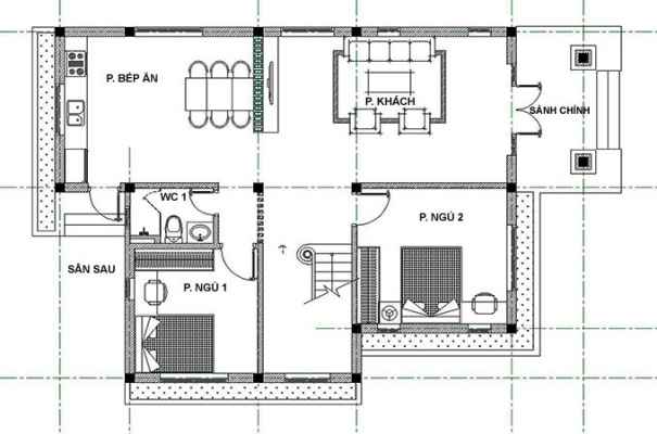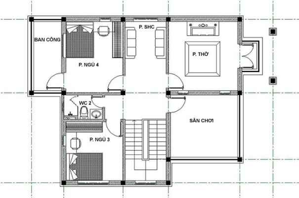 Gồm: nhà nguyện, phòng khách, 2 phòng ngủ và 1 vệ sinh chung. Phòng thờ được bố trí phía trước nhà, cạnh sân chơi và phòng sinh hoạt chung. Tiếp đến là 2 phòng ngủ được bố trí ở 2 góc phía sau của ngôi nhà vừa mang đến sự thuận tiện về ánh sáng và thông gió tự nhiên. Nhà vệ sinh nằm giữa 2 phòng ngủ thuận tiện cho việc sinh hoạt của cả tầng. Mẫu thiết kế biệt thự mini 2 tầng toát lên vẻ bề thế, sang trọng và ấm áp, tiếp tục là sự đơn giản nhẹ nhàng tạo nên nét độc đáo cho ngôi nhà. Qua góc nhìn cũng như công năng, chúng ta thấy được phần nào tài năng của nhà thiết kế.