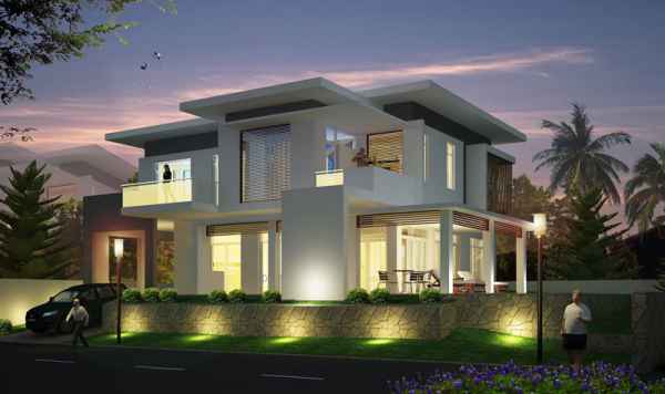 Phối cảnh tổng thể của ngôi biệt thự nghỉ dưỡng 4 tầng độc đáo, kiên cố và hiện đại. Nhìn chung, ngôi biệt thự này đạt được yếu tố thẩm mỹ cao là sự nguy nga, tráng lệ và vô cùng vững chãi với những cột vuông, hình khối đơn giản nhưng vẫn đạt hiệu quả thẩm mỹ cao, ngôi biệt thự không chỉ đạt tỷ lệ chiều cao mà còn tạo sự gần gũi, ấm cúng cho khách và gia chủ khi họ đến gần hơn. Mẫu biệt thự nghỉ dưỡng mang phong cách kiến trúc biệt thự hiện đại sử dụng kết hợp nhiều vật liệu khác nhau, đồng thời sử dụng nhiều vách ngăn kính tạo màu sắc nổi bật và vật liệu tương phản mang đến sự thông thoáng tối đa, gần gũi với thiên nhiên. Về màu sắc, căn biệt thự pha trộn những gam màu nhã nhặn với những gam màu tương phản khác, phù hợp với chức năng thư giãn và phục hồi năng lượng sau khi làm việc mệt mỏi. Phong cách và đẳng cấp của chủ sở hữu cũng được đảm bảo thông qua hình thức công năng này.