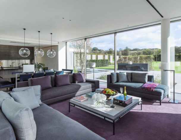 Bên trong, thiết kế nội thất biệt thự nghỉ dưỡng luôn đáp ứng hoàn hảo những tiện nghi cho việc nghỉ dưỡng, với phòng khách được đặt ở vị trí “đắc địa” để có thể nhìn ra xung quanh. Một bộ bàn ghế sofa đẹp màu xám, được trang trí thêm thảm trải sàn và lọ hoa trang trí càng làm tăng thêm vẻ đẹp lãng mạn khác.