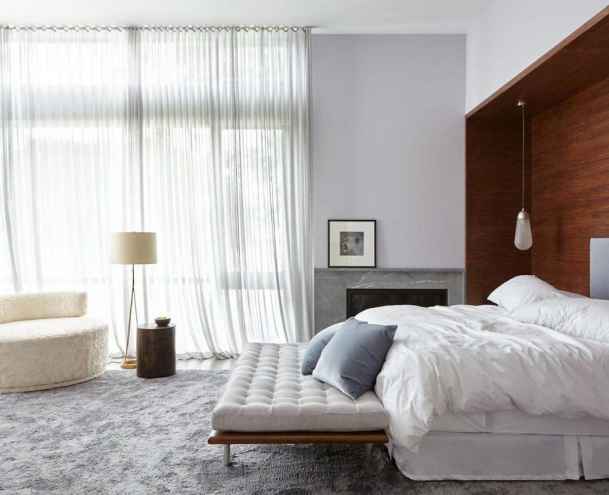 Phòng ngủ màu trắng xám nhẹ nhàng, rèm cửa mềm mại, cộng hưởng của tấm thảm êm ái khiến căn phòng trở nên thoáng mát hơn. Chất liệu gỗ mang đến sự ấm áp cho phòng ngủ và giảm bớt sự lạnh lẽo.