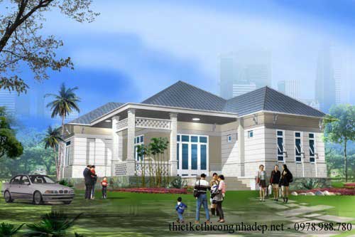 Hình ảnh phối cảnh mẫu biệt thự nhà vườn 1 tầng mái thái đẹp ở nông thôn