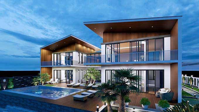 Một mẫu thiết kế biệt thự sân vườn 2 tầng vô cùng hiện đại, lộng lẫy, tiện nghi mà có thể bạn mới chỉ được trông thấy trên phim truyền hình của giới siêu giàu. Tất cả các chi tiết của thiết kế này đều hoàn hảo đối với ai yêu thích tiệc tùng, sôi động. Từ thiết kế quầy bar gần bể bơi, ghế tám náng, tầng trệt được mở rộng không gian hoàn toàn đến bố cục của 2 biệt thự riêng biệt được kết nối bằng hành lang rộng rãi...