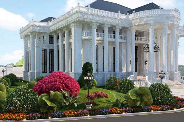 Mẫu thiết kế biệt thự sân vườn 2 tầng theo phong cách tân cổ điển duy nhất mà chúng tôi gợi ý trong bài viết này. Đây là một mẫu thiết kế vô cùng sang trọng, cầu kỳ của cả khoảng sân vườn và chính căn biệt thự. Can nhà sử dụng tone màu trắng toàn bộ cũng như rất nhiều những cột trụ tròn chạm trổ hoa văn là đặc trưng của kiến trúc phong cách La Mã. Khoảng sân vườn sử dụng nhiều loài cây cỏ mang màu sắc rực rỡ làm sáng bừng cả không gian.