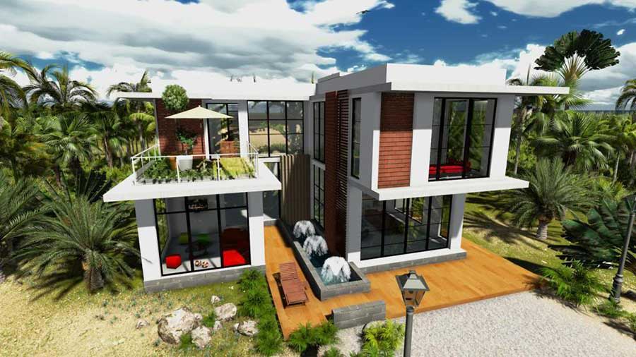 Một gợi ý thiết kế mẫu biệt thự sân vườn 2 tầng mang phong cách đơn giản, hiện đại, trẻ trung. Đây là một giải pháp nếu diện tích đất xây dựng của bạn không quá lớn mà vẫn yêu thích đặc biệt kiểu thiết kế này. Đơn giản là nhà mái bằng 2 tầng với không gian tầng trệt mở đã hoàn toàn kết nối nhà ở với sân vườn xung quanh thành một thể thống nhất. Vì là nhà mái bằng nên cây xanh được sử dụng để trang trí để tránh ánh nắng cũng như tạo nên sự logic trong tổng thể thiết kế.