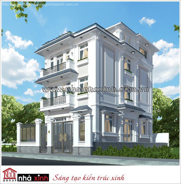 Đây là một thiết kế biệt thự tân cổ điển mái bằng nên khoảng không phía trên sẽ là một sân thượng siêu rộng. Bạn có thể dùng thang để di chuyển lên sân thượng thư giãn hay có thể trồng rau xanh cho cuộc sống gia đình. Từ hình khối khỏe khoắn của mẫu biệt thự trên cho chúng ta thấy vẻ đẹp trong kiến trúc xây dựng và thiết kế độc đáo của nghành kiến trúc. Hàng dào và cổng biệt thự đều được thiết kế và trang trí với tông màu trắng mang đến sự thanh lịch cho căn biệt thự tân cổ điển này.