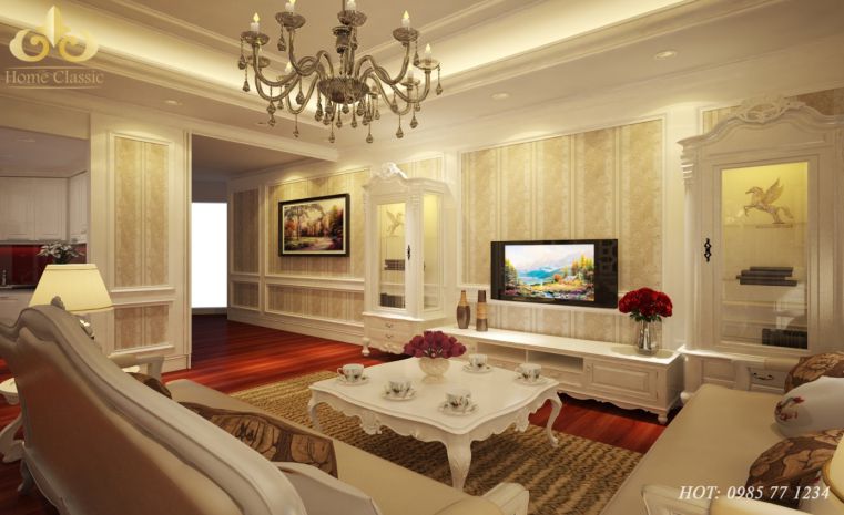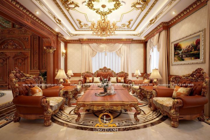 Với mẫu nội thất trên bạn nhìn thấy ngay các họa tiết hoa văn mang đậm màu sắc phương Tây, và những chiếc đèn chùm lộng lẫy lung linh tạo sự trang trọng nguy nga đang đứng giữa biệt thự tiền bạc tỷ của bạn. Không gian phòng khách được huy hoàng hơn nhờ tông màu tươi sáng của mẫu nội thất này.Sự kết hợp màu sắc có khoa học và hiện đại mang đến dáng vẻ tân cổ điển tuyệt đẹp. Sự khéo léo kết hợp bộ sofa vải cao cấp để tạo nên độ thẩm mỹ. Ngoài ra hình ảnh về mẫu nội thất còn cho chúng ta thấy những bức trang tân cổ điển tuyệt đẹp được treo trên tường làm tăng lên giá trị của ngôi biệt thự