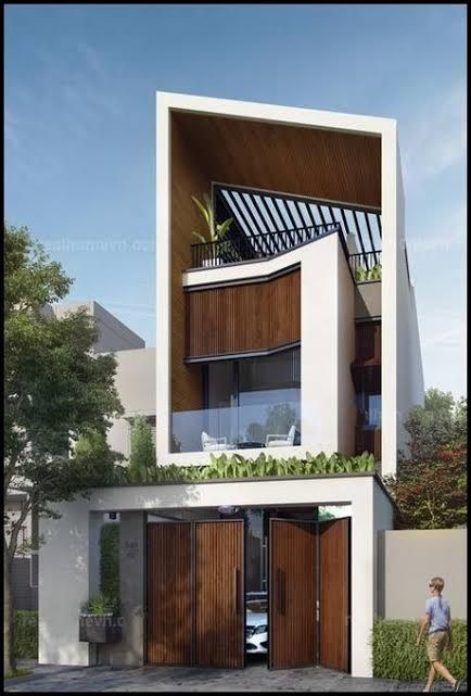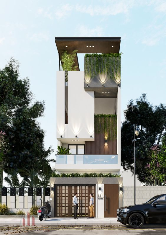 Mặt tiền 3 tầng này độc đáo với thiết kế hiện đại, sử dụng hệ thống cửa gỗ đan xen, mang lại không gian mở, không bị bí bách như những ngôi nhà cửa gỗ thông thường, kết hợp với vách chắn gỗ, tăng tối đa sự thông thoáng cho căn nhà. Sử dụng vách ngăn hình hoa văn cũng đem lại vẻ đẹp cho ngôi nhà, ết hợp với trồng cây tạo không gian xanh.