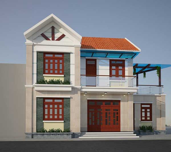 Mẫu nhà có 1 trệt 1 lầu lợp mái tôn theo lối kiến trúc hiện đại. Phần ngoại thất được trang trí mới mẻ bởi hệ thống cửa sổ và cửa chính đều được sử dụng bằng gỗ rất đẹp. Phía mái hiên che chắn và ban công được lợp và dùng chất liệu kính cường lực chắc chắn, vừa đảm bảo nét thẫm mỹ cho căn nhà lại phát huy được những công năng rất hữu ích. Cách xây dựng và bố trí chỗ trồng hoa ở tầng trệt và tầng lầu hài hòa, khiến cuộc sống của gia chủ trở nên thư giản, thoải mái hơn. Nhìn chung, căn nhà được bố trí với lối kiến trúc sang trọng, phù hợp cho các hộ gia đình trẻ ngày nay.