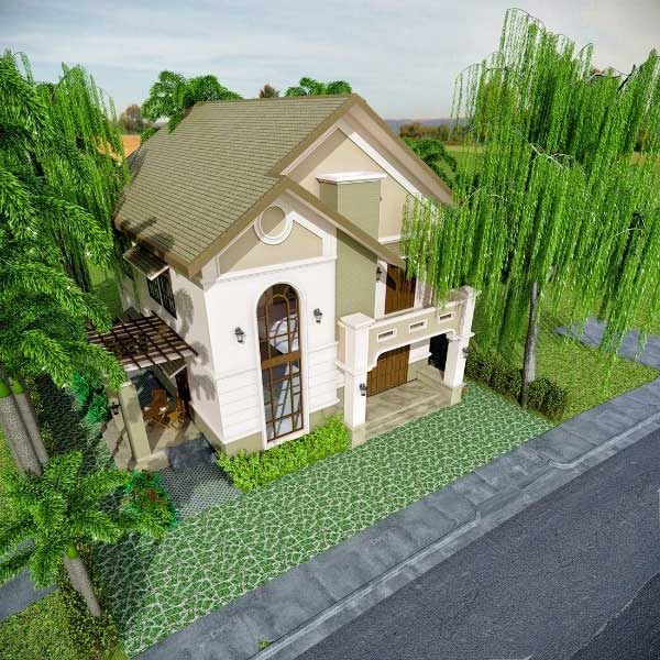 Thiết kế hài hòa giữa gam màu trắng thanh thoát và màu xanh ghi khiến căn nhà trở nên đẹp mắt và thẫm mỹ hơn so với những căn nhà bình thường khác. Ngoại thất bên ngoài căn nhà được bố trí cân đối, phù hợp với kiến trúc. Hệ thống cửa được thiết kế theo khối vòm, ngoài ra còn có ống thông từ mái nhà xuống rất sang trọng và hiện đại. Sự kết hợp với thiên nhiên cây cỏ xung quanh cũng là 1 ý tưởng không tồi. Đây chắc chắn là mẫu nhà được các hộ gia đình Việt ưa chuộng hiện nay.