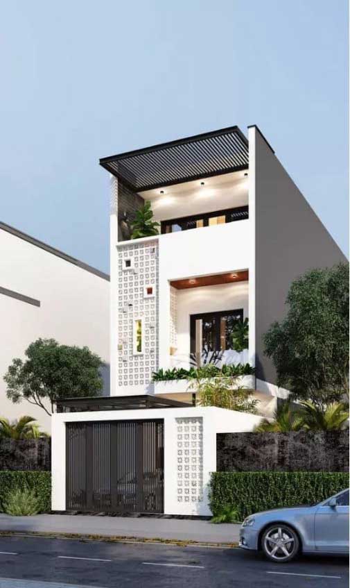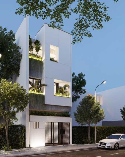 Ngôi nhà khoác lên mình lớp áo trắng tinh khôi, kết hợp hoàn hảo, hòa quyện giữa kiến trúc và thiên nhiên. Nét đặc sắc của ngôi nhà là có trồng cây trước ban công. Gia chủ trồng 2 cây cau cảnh tạo vẻ đẹp truyền thống, tận dụng phần tường trước ban công trồng cây bò sát rũ xuống tăng tính thẩm mĩ cho ngôi nhà. Không những thế, tất cả những chỗ có thể trồng được cây đều được gia chủ tận dụng để mang lại không gian xanh, gần gũi với thiên nhiên.