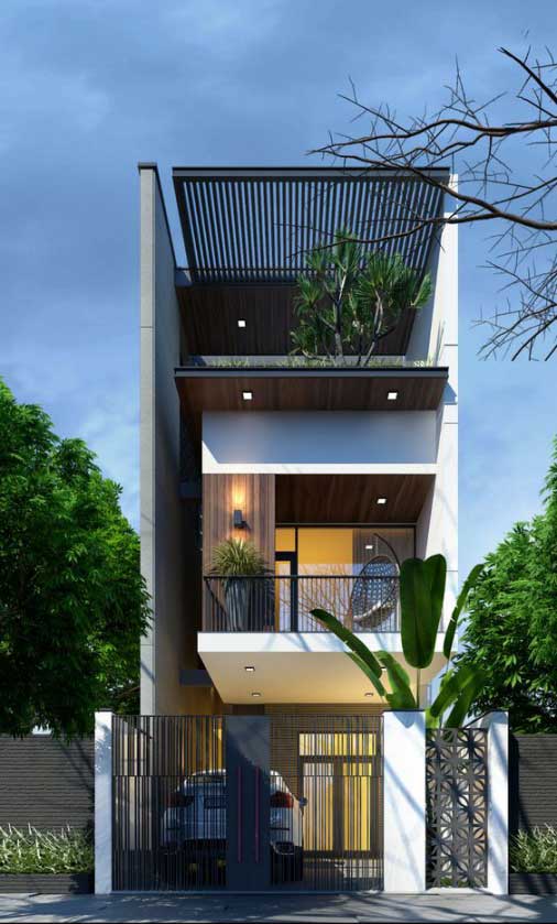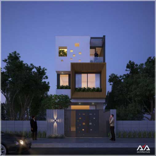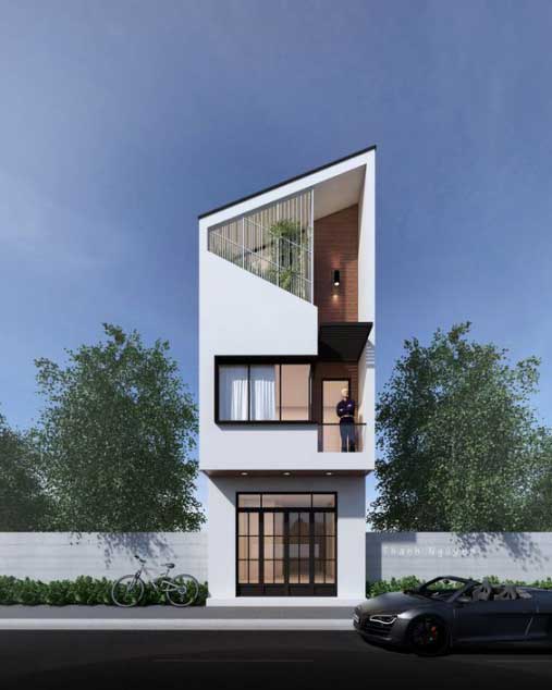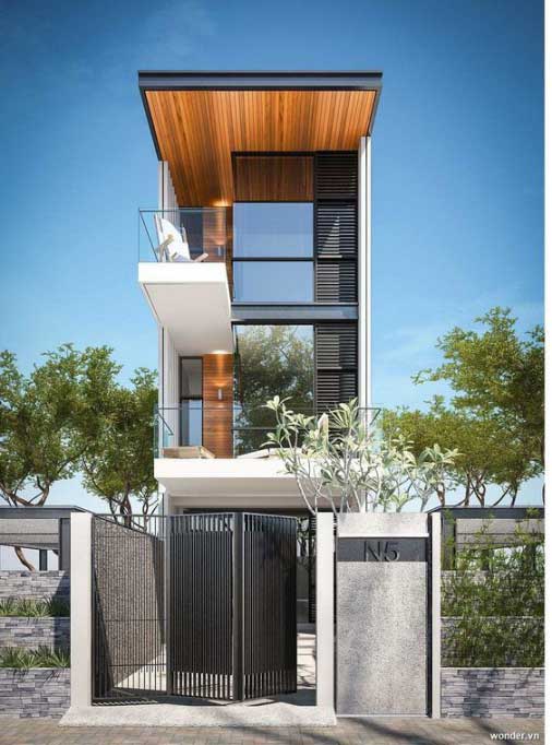 Ngôi nhà là sự hoàn hảo của việc sáng tạo nên các hình khối sinh động, vững chắc. Việ kết hợp mái dốc 1 bên tạo sự mới lạ cho căn nhà, đồng thời còn giúp thoát nước tốt, một giải pháp thật độc đáo. Những mảng gỗ ốp trên tường tạo cảm giác ấm cúng hơn. Sử dụng rào chắn sắt trên tầng 3 giúp ngôi nhà thêm nổi bật, bên trong có trồng cây, giúp ánh sáng tự nhiên đi vào tốt hơn, cây sẽ khỏe và thanh lọc tốt hơn.